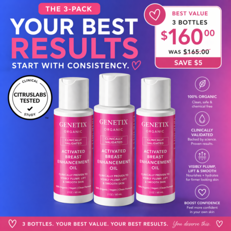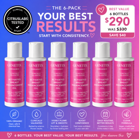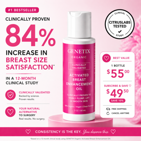 Genetix Activated Enhancement Oil is the first and only clinically validated organic formula designed to support visible improvement in breast appearance through consistent, daily use.